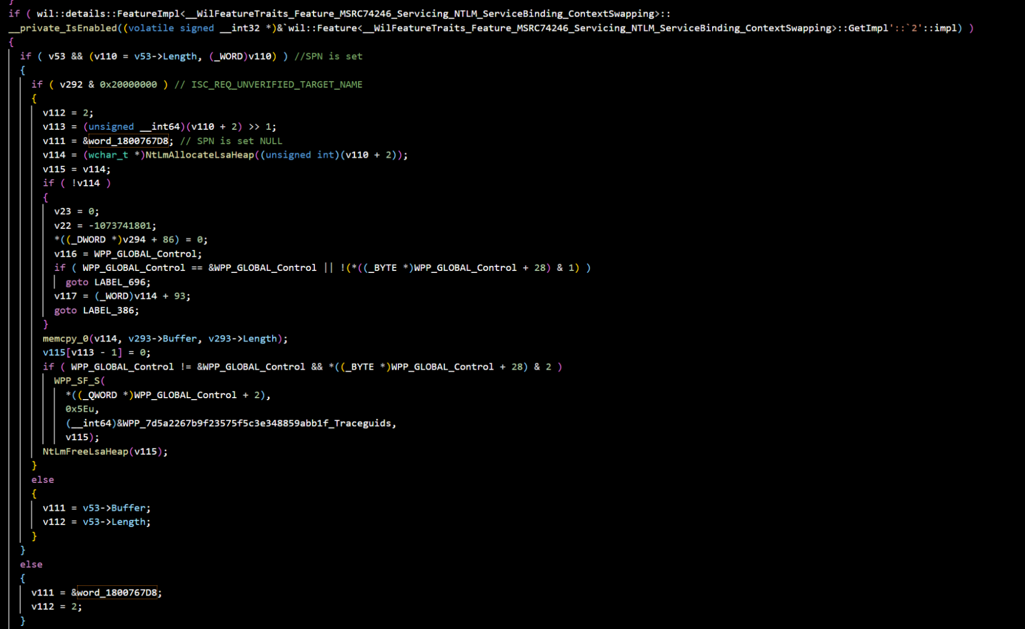 We observed the addition of a new check for the enabled feature “Feature_MSRC74246_Servicing_NTLM_ServiceBinding_ContextSwapping” when authentication occurs: